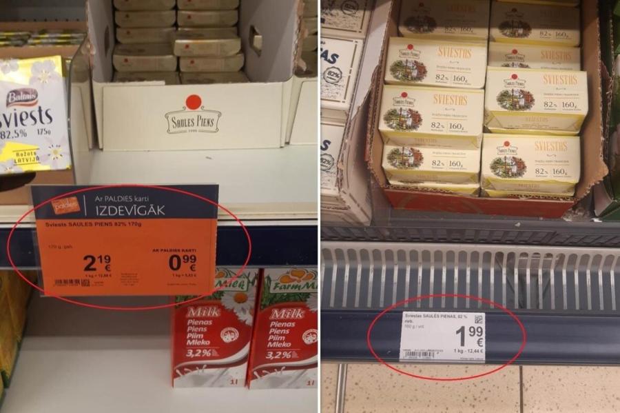 К тому же на многие товары распространялась дополнительная скидка с использованием карты покупателя. Аисте заметила, что масло с картой лояльности стоит в Латвии 0,99 евро, а в Литве такое же масло стоит 1,99 евро.