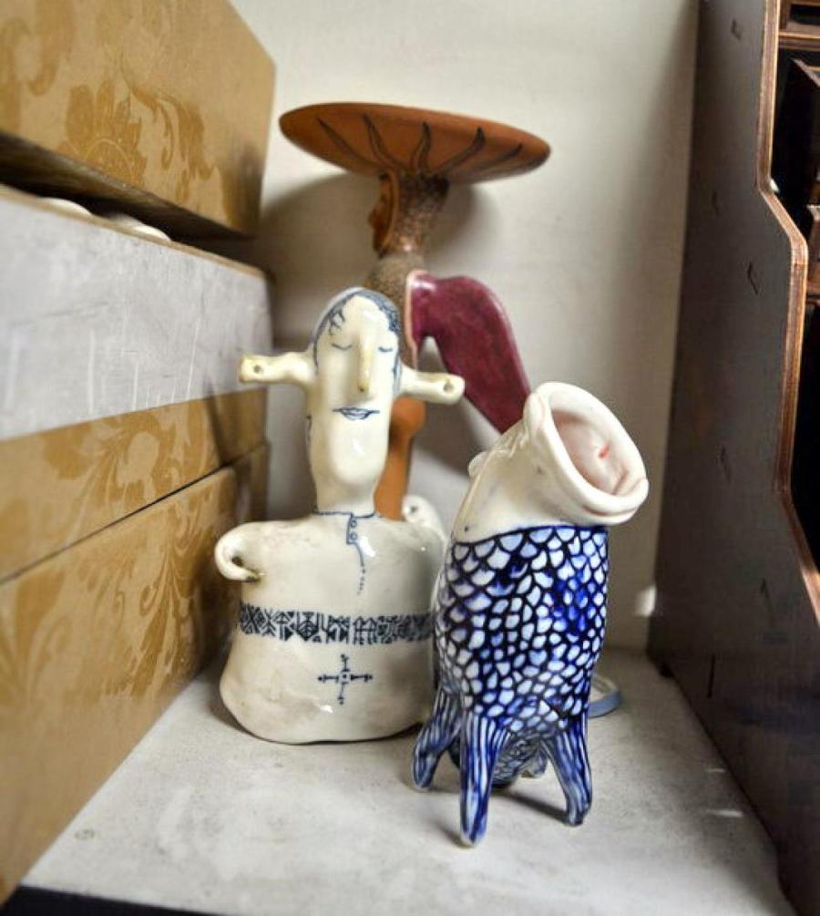 — Видишь, котик такой с усиками стоит? Гитлерчик. Из серии, которая разлетелась на ярмарке в Академии художеств. Мы туда еще рыбку внутрь вклеивали, как бы получался колокольчик, два предмета по цене одного. Котики продавались перед Рождеством, наделали мы их с запасом, штук сто, и продали все!
