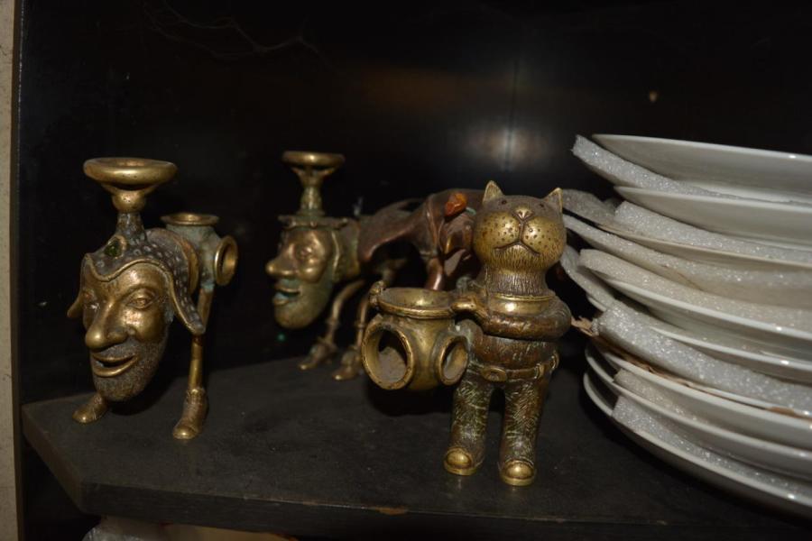 А рядом с этим полным отрицательного обаяния персонажем — печальный основатель первого в мире государства рабочих и крестьян, маленький, с крылышками летучей мыши, на коленях. "Вещь культовая", — открывает мастер функционал настольного Ильича. Правда, лишь очень продвинутый адепт ленинизма воспримет такого вождя. Фигурка полая, можно залить масло, и получится лампадка.